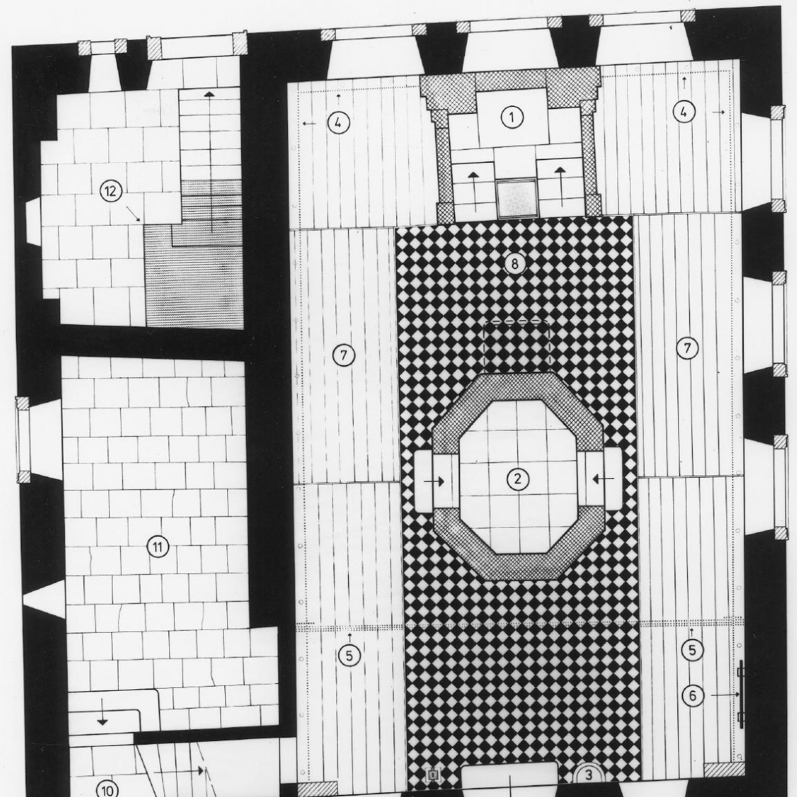| Fußboden: | unterteilt in schwarz-weiß gefliesten Steinboden und Holzboden, neu nach Fotovorlagen |