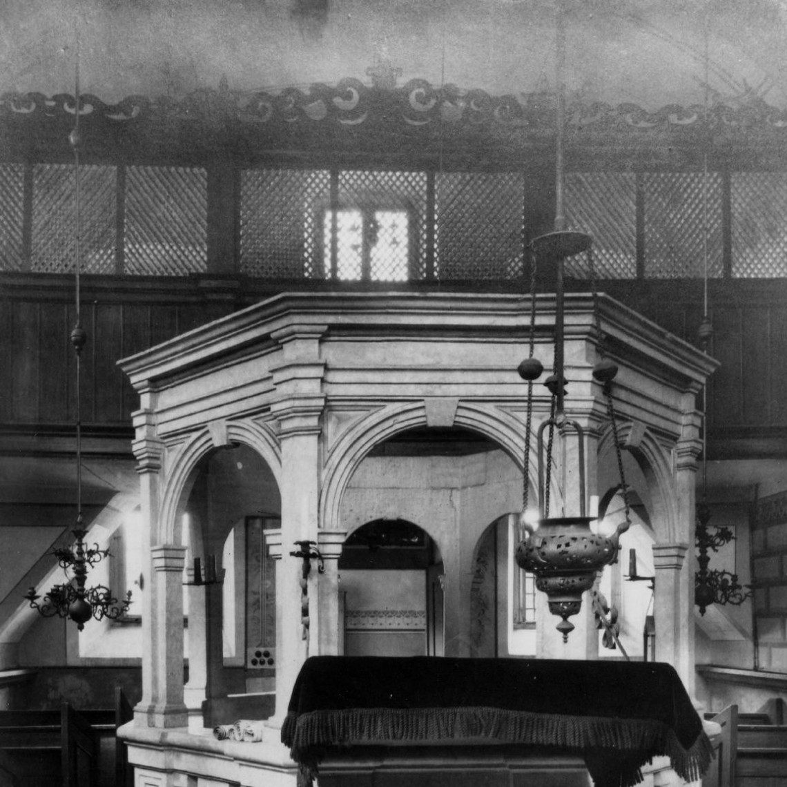 | Gestühl: | ursprünglich einzelne Stühle, seit dem 19. Jahrhundert entsprechend dem Zeitgeschmack auf den Toraschrein im Osten ausgerichtet; nach Fotovorlagen neu angefertigt |